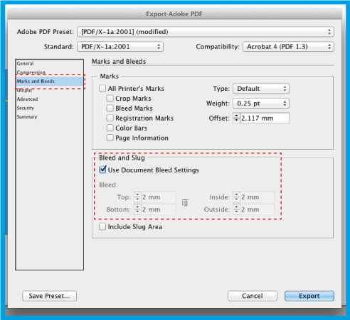 .Faça com que os elementos do seu fundo (imagens, cor, linhas...) batam nas extremidades. Coloque os textos dentro da linha rosa (margem de segurança), garantindo que os mesmos não sofram um corte aquando da impressão.