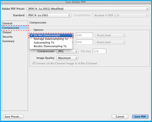 .De seguida selecione e do lado direito em selecione a . Esta opção garante que grave o seu ficheiro sem perfis de cor. Abaixo, clique em Save Preset… , salve estas predefinições de PDF com o nome que desejar, para poder reutilizá-la sempre. Clique em .