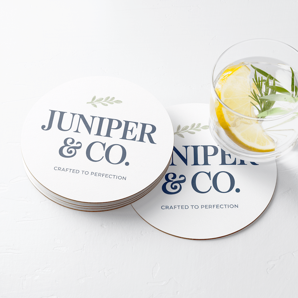 Bases para copos elegantes feitas para entusiastas de gin. Personalizável com logotipos, citações ou designs. Perfeito para bares de gin, degustações e eventos.